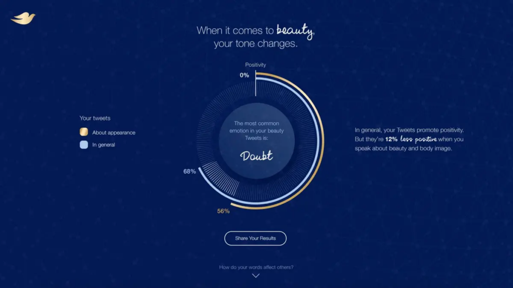 - Beauty Quotient analyzes a female user’s mood in conjunction with changes in tone during conversations regarding beauty in the aim of revealing which of around 45 emotions she most commonly expresses in these tweets.